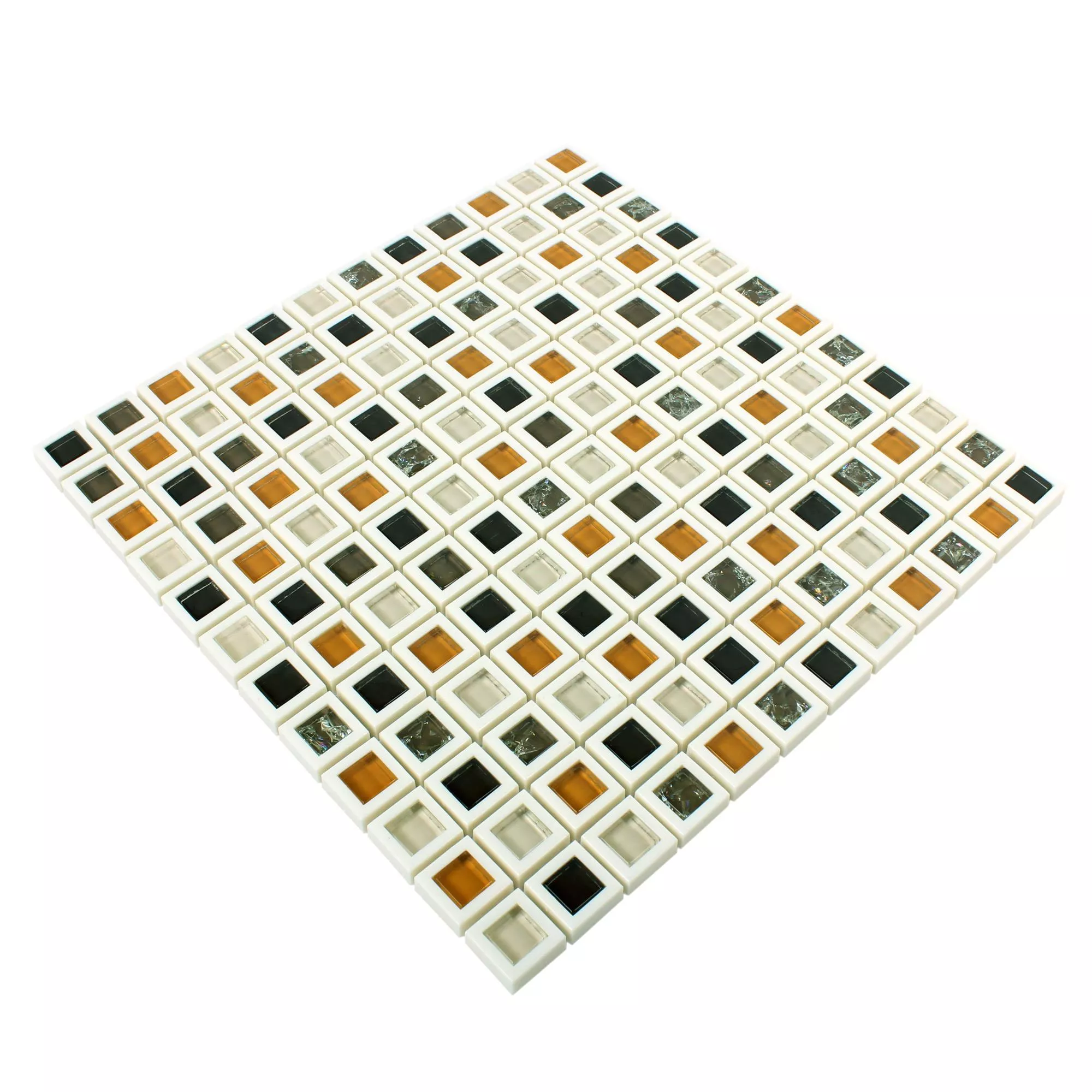 De mozaïektegels in de groen-witte verpakking combineren helder wit met accenten in verschillende tinten groen, waarvan sommige neigen naar blauwachtig. In de andere lichte variant wit, donker en geelbruin glas zetten kleur highlights. De individuele wandtegels worden elk omzoomd door een wit kader.