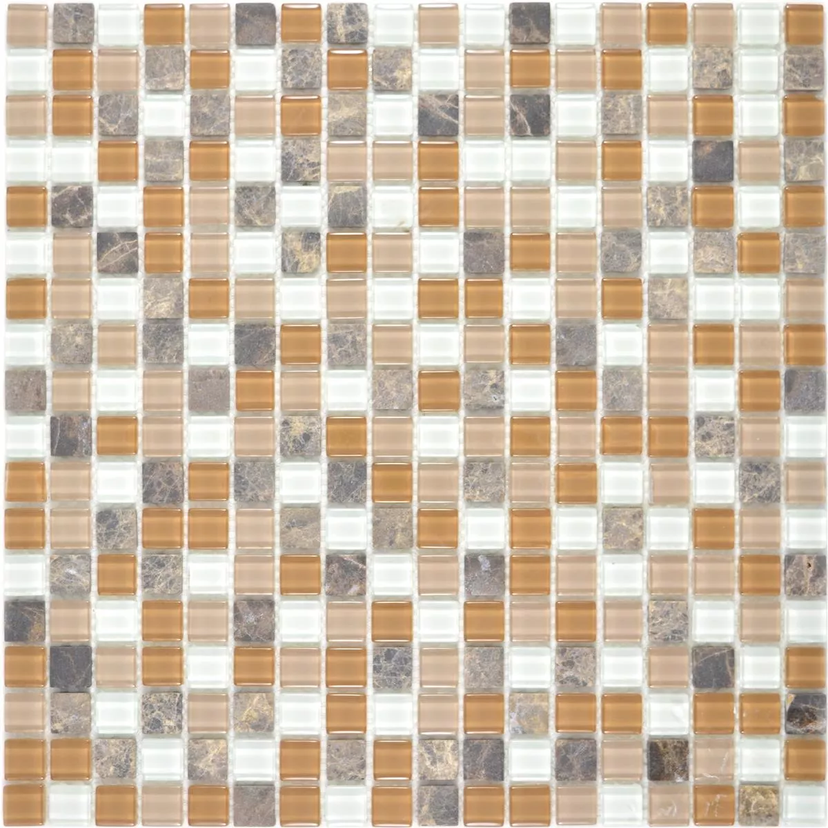 De glazen natuursteen mozaïektegels Zekova in de kleurvariant beige bruin wit bestaan afwisselend uit marmer en glas. De glazen natuursteen mozaïektegel Zekova heeft een steenmaat van 15 x 15 mm. Verder hebben de stenen afwisselend een mat en glanzend oppervlak.