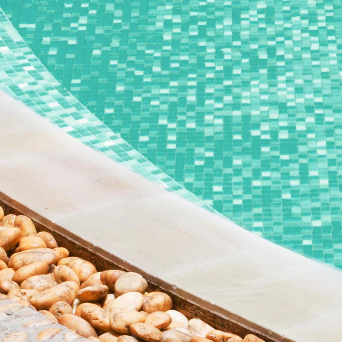 Het glazen zwembadmozaïek Lagoona in levendig turkoois brengt de heldere sfeer van een Turks lagunebad direct bij u thuis.