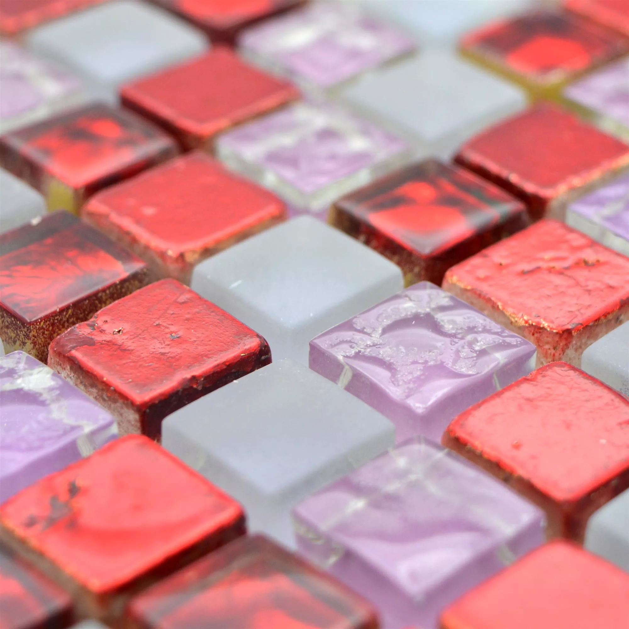 De Cleopatra-mozaïektegels in de levendige kleuren rood, roze en wit combineren natuursteen en glas tot een fascinerend ontwerp dat zowel mat als glanzend is. Deze tegels zijn speciaal ontworpen voor muren en bieden een opvallende, elegante uitstraling.
