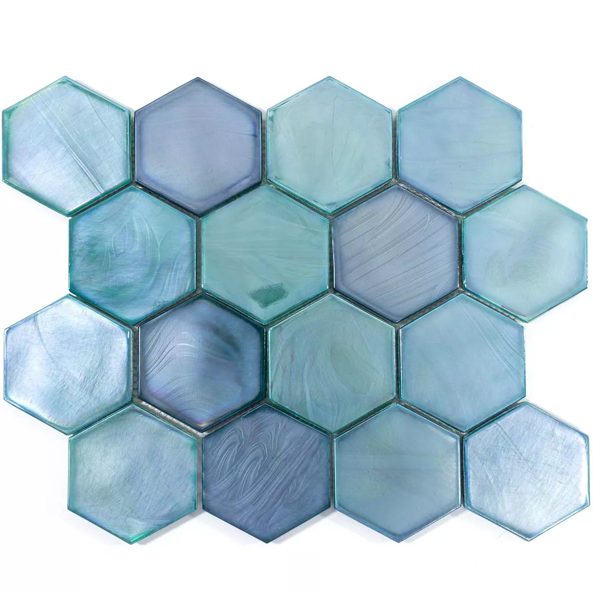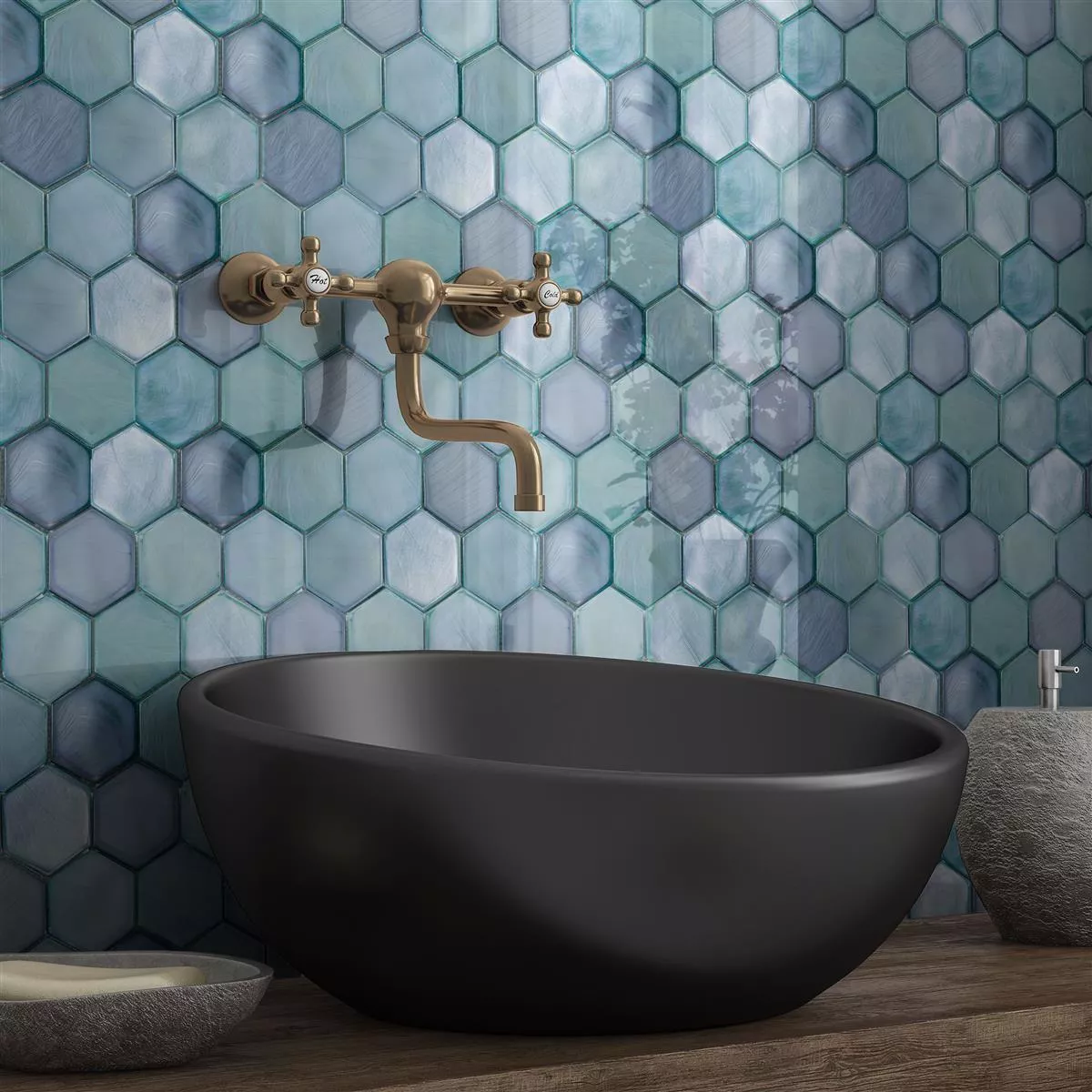 De Andalucia Hexagon glasmozaïektegels in zeegroen presenteren zich als moderne en verfrissende wanddesignelementen voor ruimtes zoals de badkamer, keuken, woonkamer en douche. Het levendige zeegroen geeft de tegels een aantrekkelijke en verkwikkende sfeer. Het glanzende oppervlak met parelmoereffect geeft de tegels bovendien een elegante uitstraling.