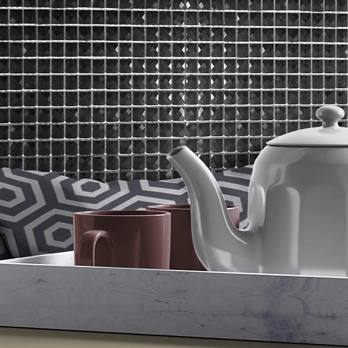 Glasmozaïektegels Black Diamond presenteren tijdloze elegantie. Deze vierkante mozaïek-, wand- en vloertegels met een steenmaat van 15x15mm geven uw interieur een glanzende, zwarte glans. Het bijzondere kenmerk dat het op een net wordt gelijmd dat klaar is voor installatie, maakt de installatie moeiteloos. Met een dikte van 8 mm en een voegbreedte van 2 mm bieden ze niet alleen esthetiek, maar ook vorstbestendigheid.