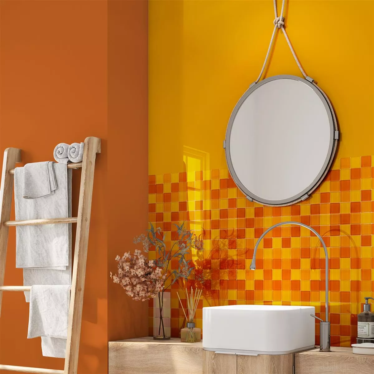 De Glasgow Orange Mozaïektegel brengt levendige kleuren en een glanzende afwerking in uw kamers en is ideaal voor elke ruimte die een opvallend en modern tintje nodig heeft. Deze tegel is ideaal voor wanden en vloeren in badkamers, keukens, interieurs en douches.