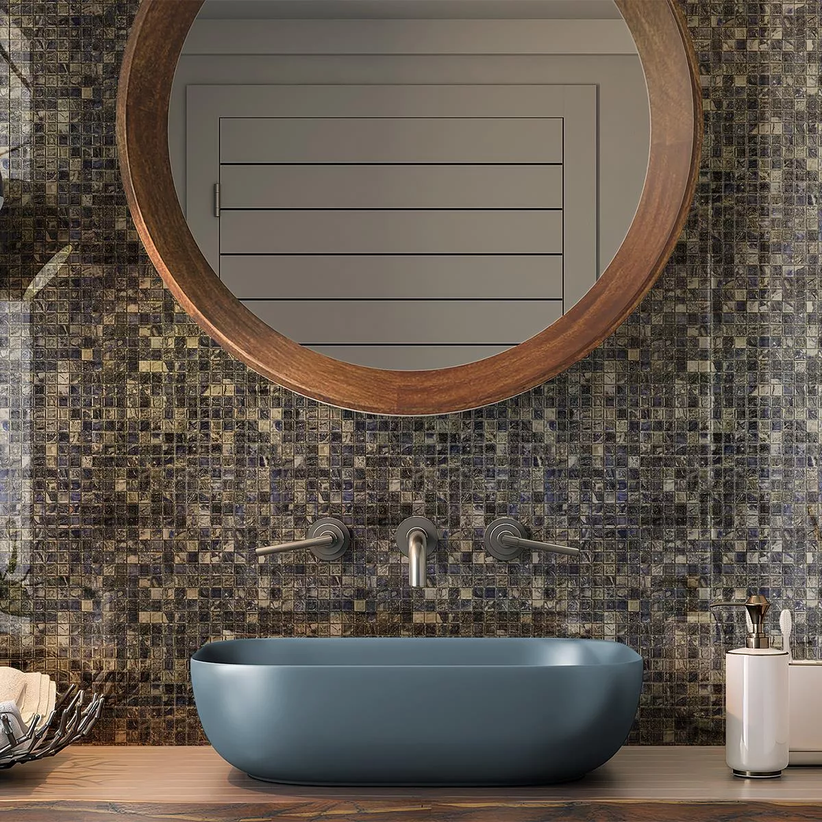 De Elysium keramische mozaïektegel in donkerblauw geeft uw kamers een elegante en diepgaande uitstraling. Het glanzende oppervlak in marmerlook creëert een luxueuze en moderne sfeer die een speciaal tintje geeft aan zowel muren als vloeren.
