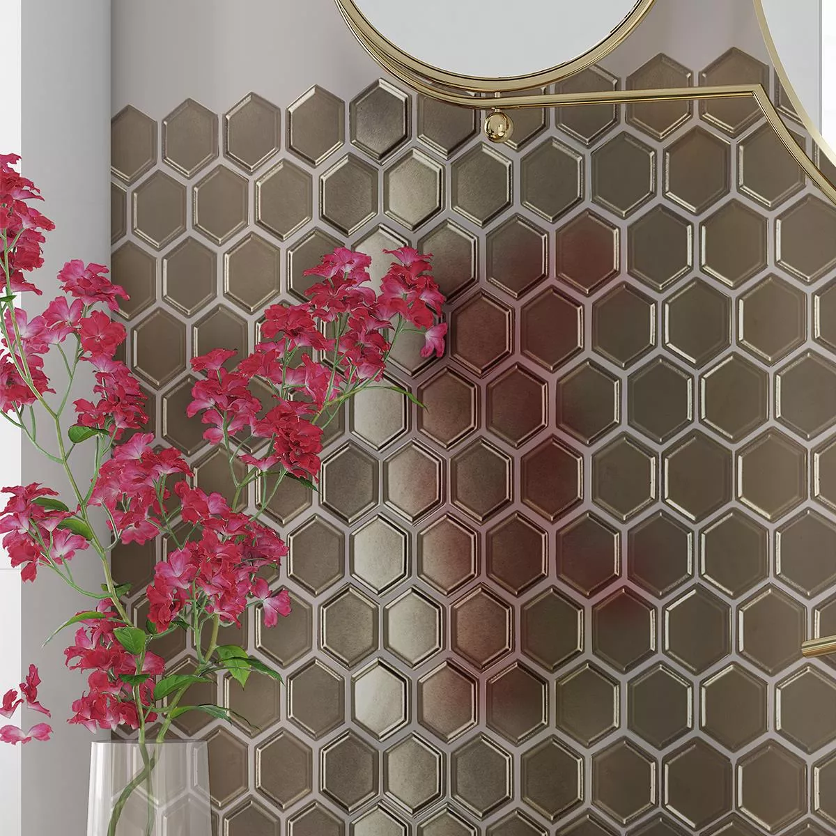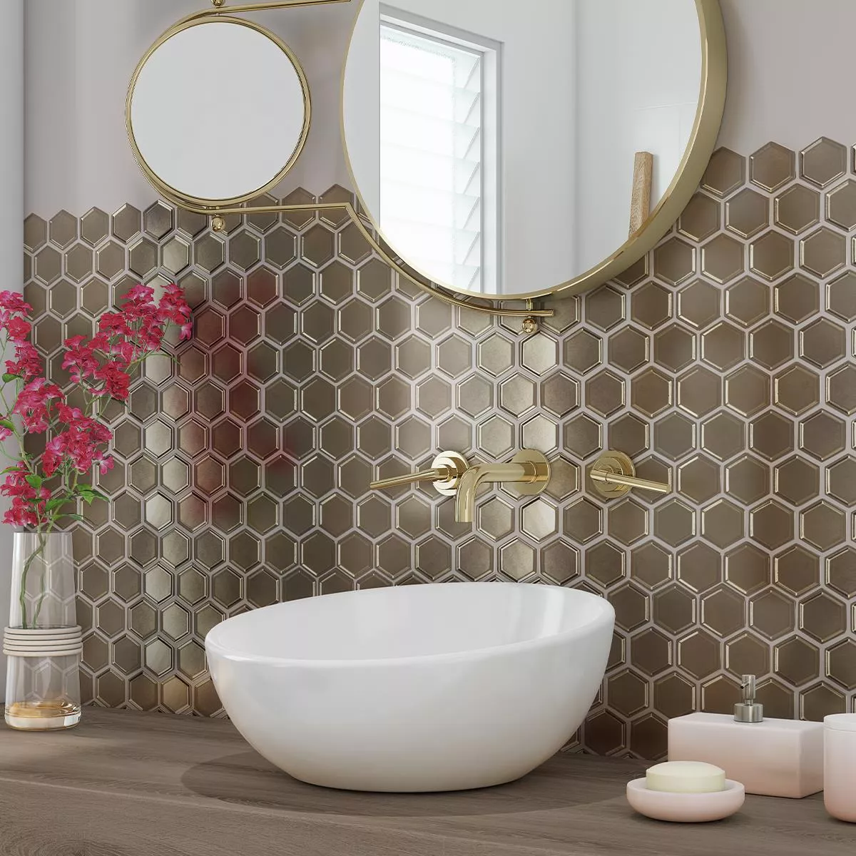 Ervaar tijdloze elegantie met onze keramische mozaïektegels Stellaris Hexagon Bronze. Deze zeshoekige vloer-, wand- en mozaïektegels geven uw interieur een unieke 3D-look in elegant brons. Het matte oppervlak en reliëfpatroon zorgen voor een luxueuze sfeer. Met een dikte van 6,5 mm en een voegbreedte van 3 mm zijn ze robuust en tegelijkertijd klaar voor installatie op een net verlijmd.