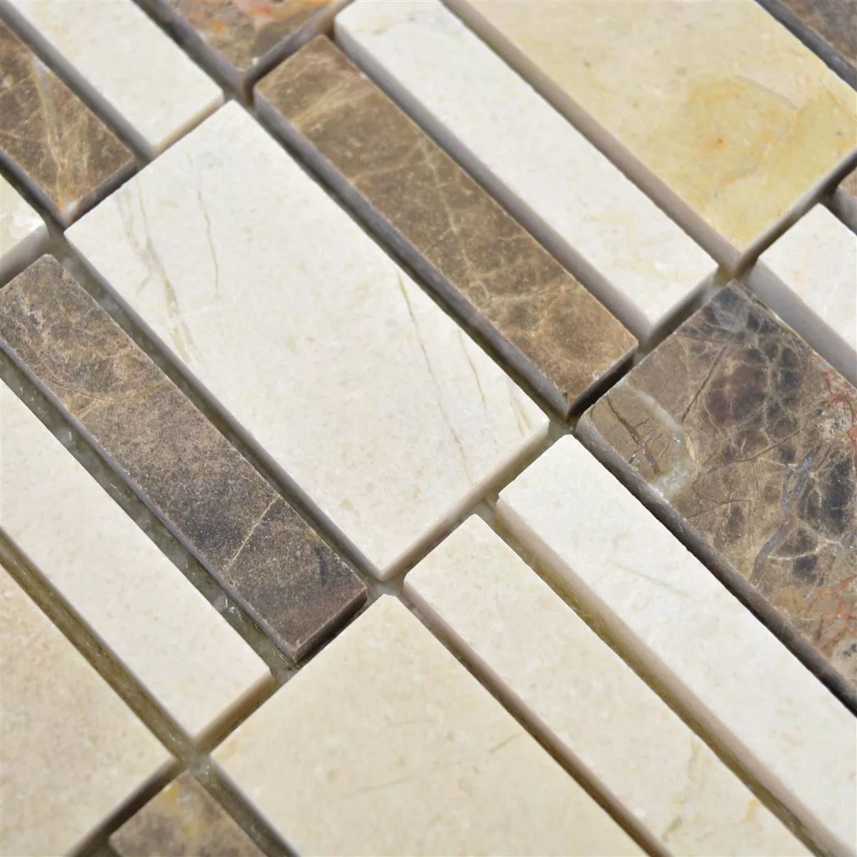 Marmeren Mozaïektegel Sunbury is gemaakt van kostbaar marmer. Het is verkrijgbaar in bruin caramel met een glanzend oppervlak en steenmaten van 23 x 48 mm, 15 x 48 mm en 10 x 48 mm.