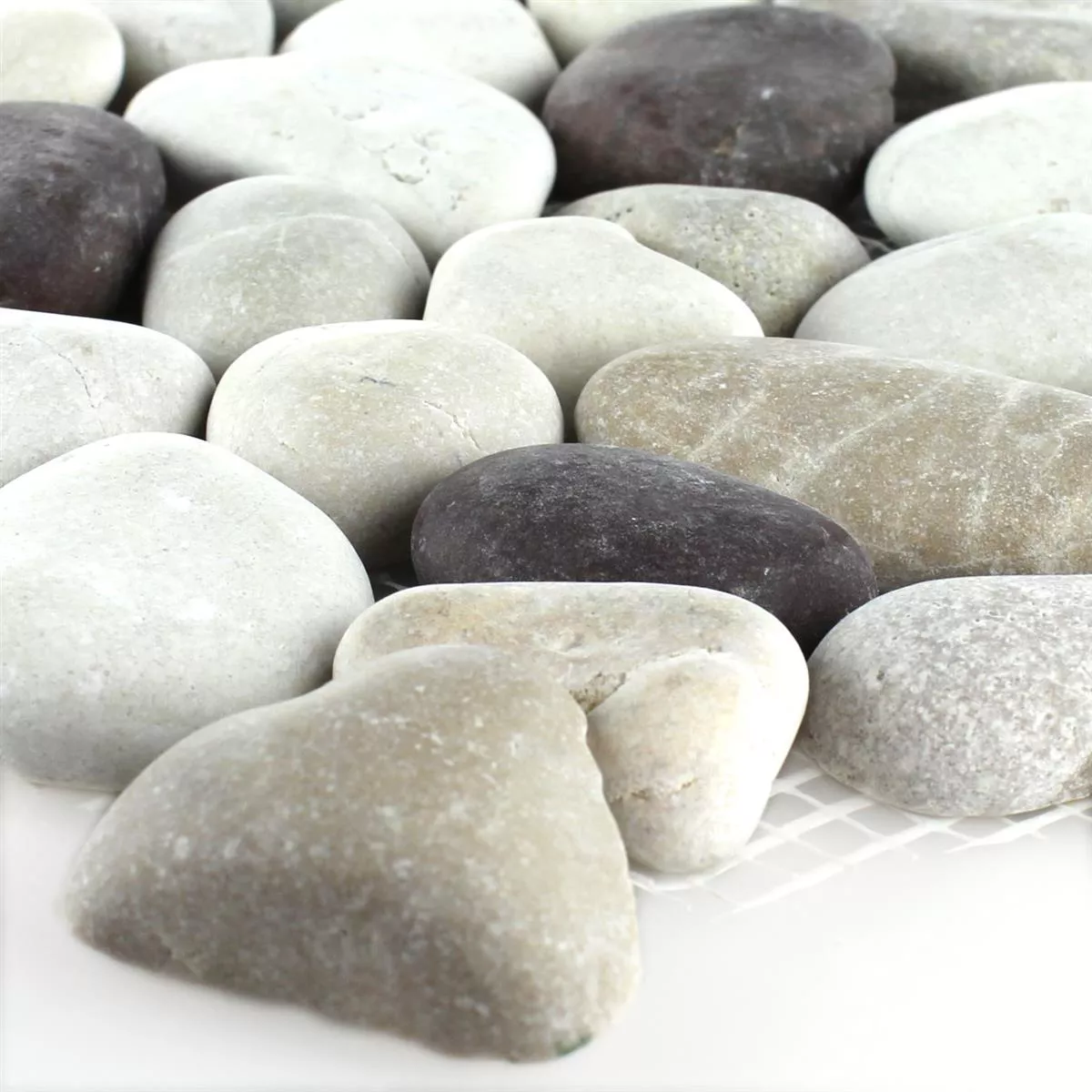 De mozaïektegels zijn verkrijgbaar in twee varianten. Enerzijds is er de variant in antraciet en anderzijds de variant in de steenmix van wit, beige en roze. De matten worden gevoegd nadat ze zijn verlijmd, waardoor een ruw oppervlak ontstaat. Ze zijn bijzonder geschikt als wandbekleding of als vloerbekleding. Naast binnengebruik zijn de rivierkiezelmozaïektegels ook geschikt voor buiten of natte ruimtes. Het verzorgen van de rivierkiezels is heel eenvoudig. Omdat het een natuurlijk materiaal is, kunnen in de handel verkrijgbare reinigingsmiddelen worden gebruikt. Ze zijn absoluut onderhoudsvriendelijk en duurzaam.