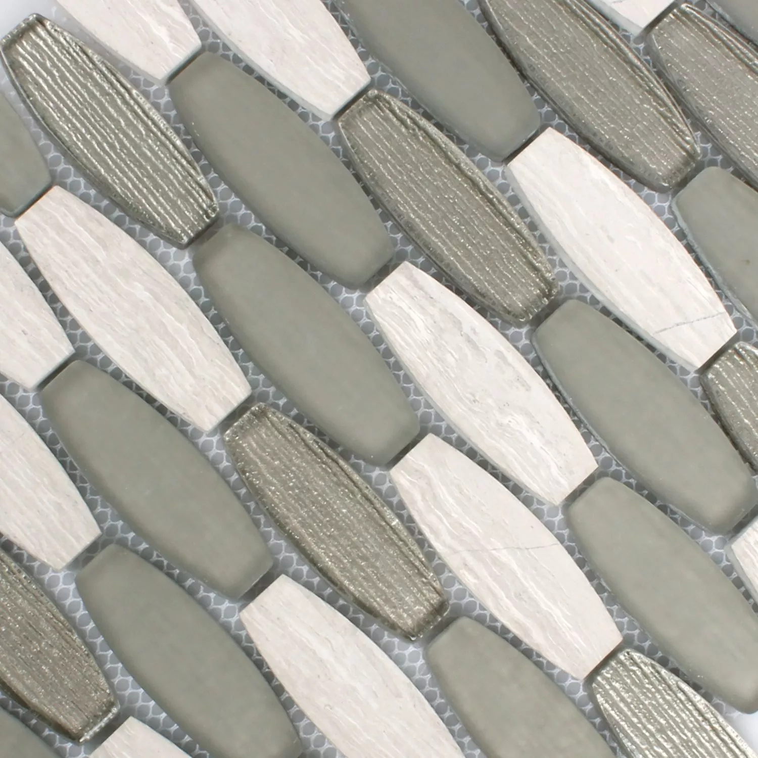 Traditioneel zijn mozaïektegels meestal vierkant of rechthoekig. De Laytamak Boat Shape Grey mozaïektegels hebben daarentegen een langwerpige vorm die doet denken aan een boot. De afzonderlijke mozaïeken zijn grijs of beige en afwisselend mat of glanzend. De combinatie van natuursteen en glas, evenals het ontwerp van het oppervlak, maakt de wand versierd met dergelijke tegels een blikvanger in elke kamer. Het voordeel van deze tegels is dat ze ook geschikt zijn voor een natte ruimte. Hierdoor kunnen deze tegels ook een wand in de keuken of badkamer decoreren, waardoor een contrast ontstaat met de andere wanden.