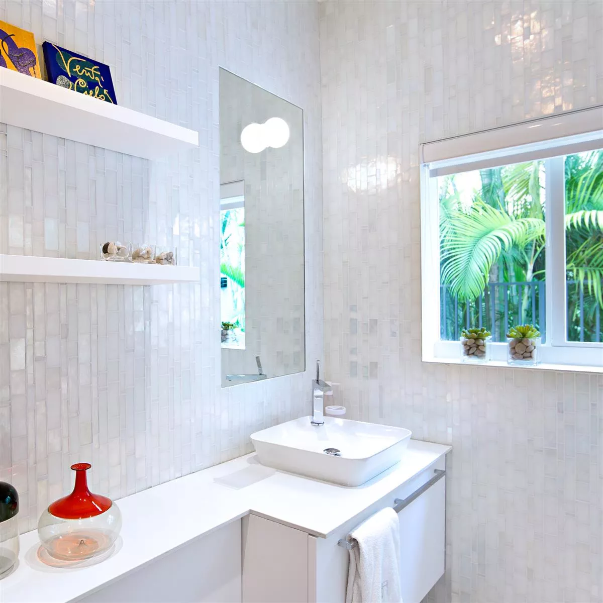 Als u bij de inrichting van een woonkamer waarde hecht aan individuele stijl, hoogwaardige materialen en een trendy uitstraling, moet u zeker kennis maken met de glasmozaïek Metropolis in Pearl. Deze glasmozaïektegel is gemaakt door de bekende en gerenommeerde Italiaanse fabrikant van glaskeramiek, het bedrijf Trend-Vi. Vloeren die zijn voorzien van glasmozaïek hebben een bijzonder elegante uitstraling, maar zijn net zo onderhoudsvriendelijk en veerkrachtig als andere tegelvloeren.De mozaïektegels zijn verkrijgbaar als sticks met een dikte van 4 mm, de matmaat is 30,8x28. 8cm.