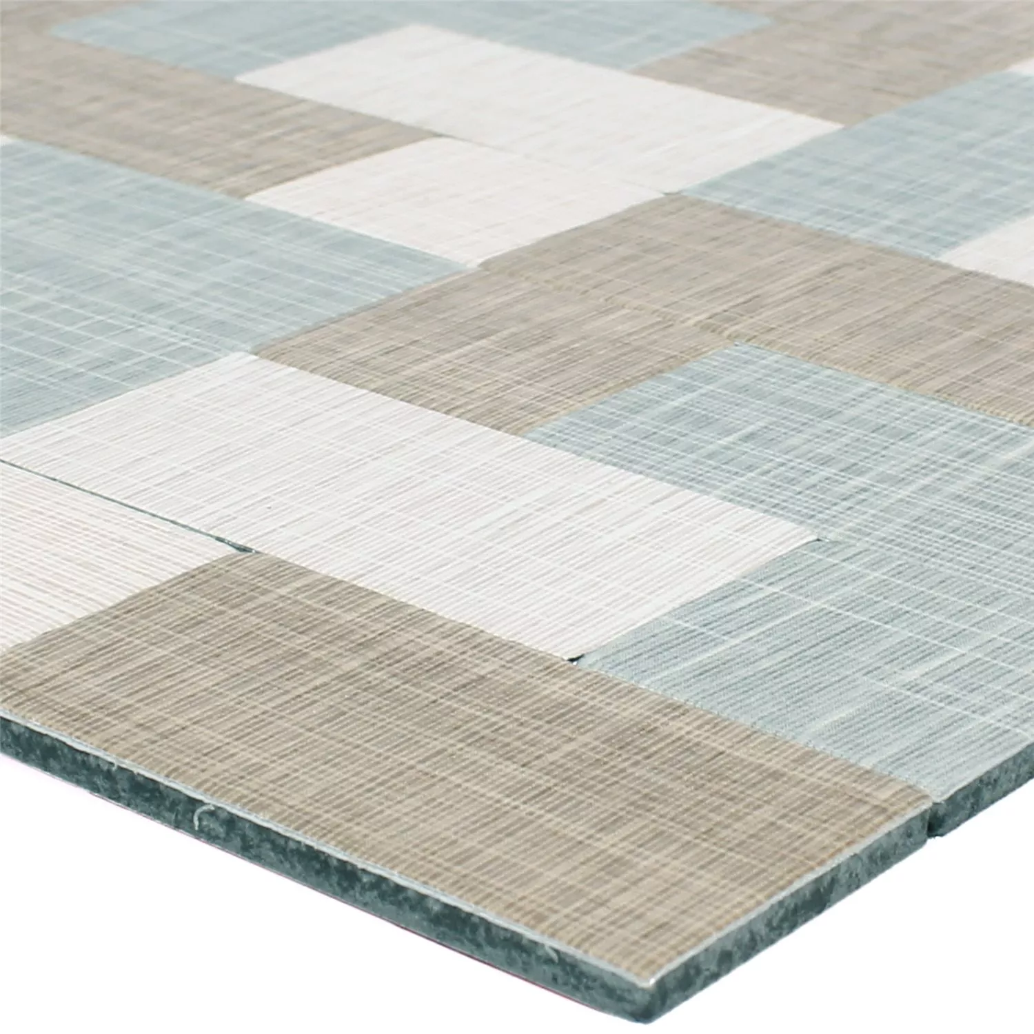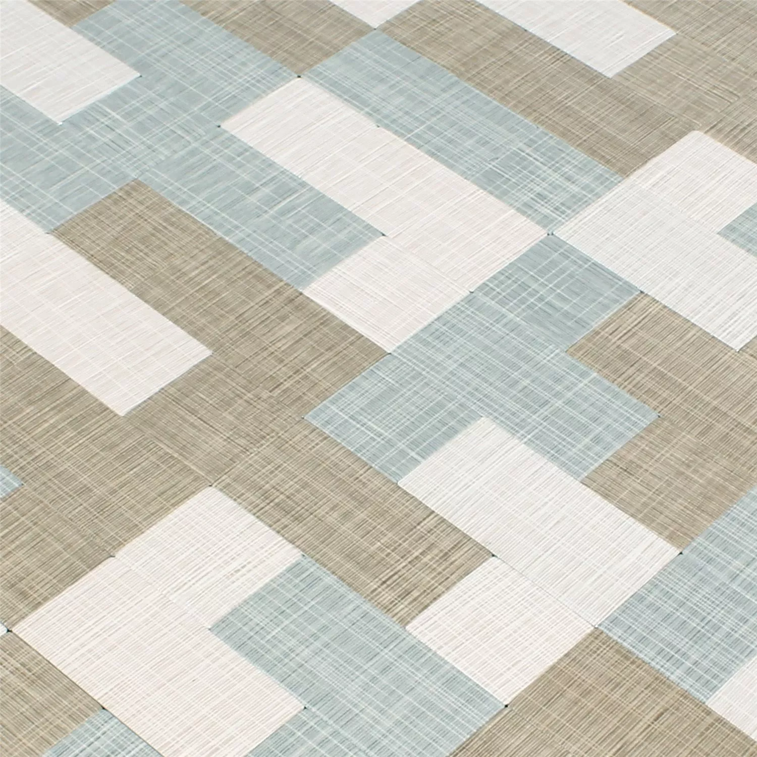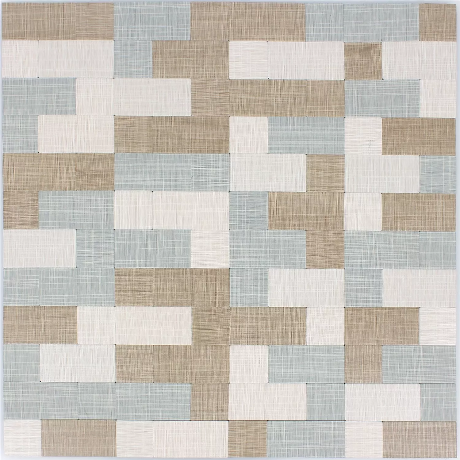 Wandtegels in bruin, grijs en beige met textielstructuur in retro en vintage look. Patronen van vierkanten of een combinatie van rechthoeken en vierkanten. De metalen mozaïektegels zijn zelfklevend en daardoor makkelijk binnenshuis te bevestigen (natte ruimtes uitgezonderd).