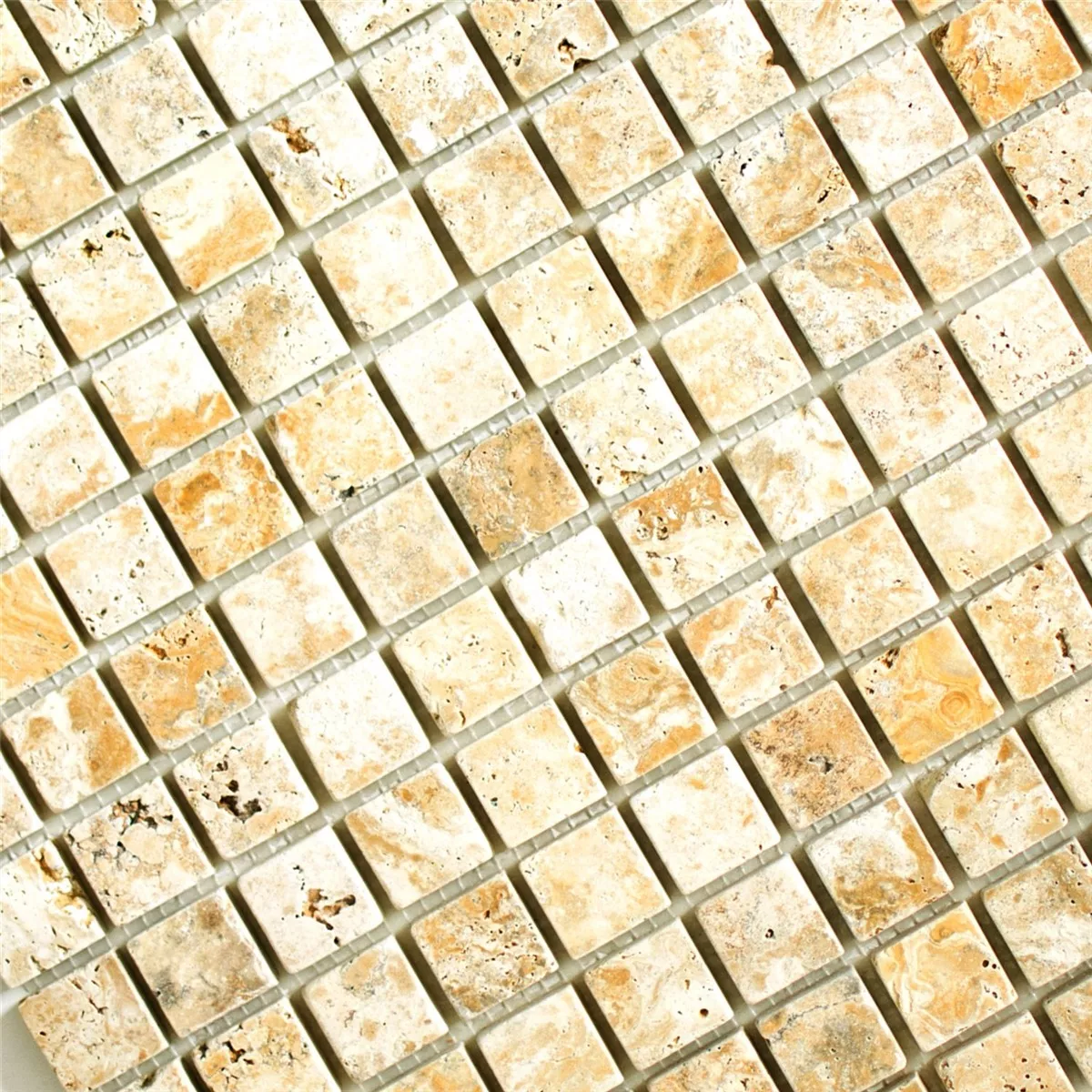 De mozaïektegels Travertin Castello Gold 23 zijn een natuurproduct. Travertijn, de steen uit Tivoli, heeft een bijzonder maritieme charme en het poreuze oppervlak maakt dit natuurproduct zo aantrekkelijk. Deze tegels, met het label Travertin Gold, hebben ook een bepaalde gouden glans in het prachtige kleurenschema. Dit zijn natuurlijke tegels die ook werken met natuurlijkheid en hun levendige oppervlak.