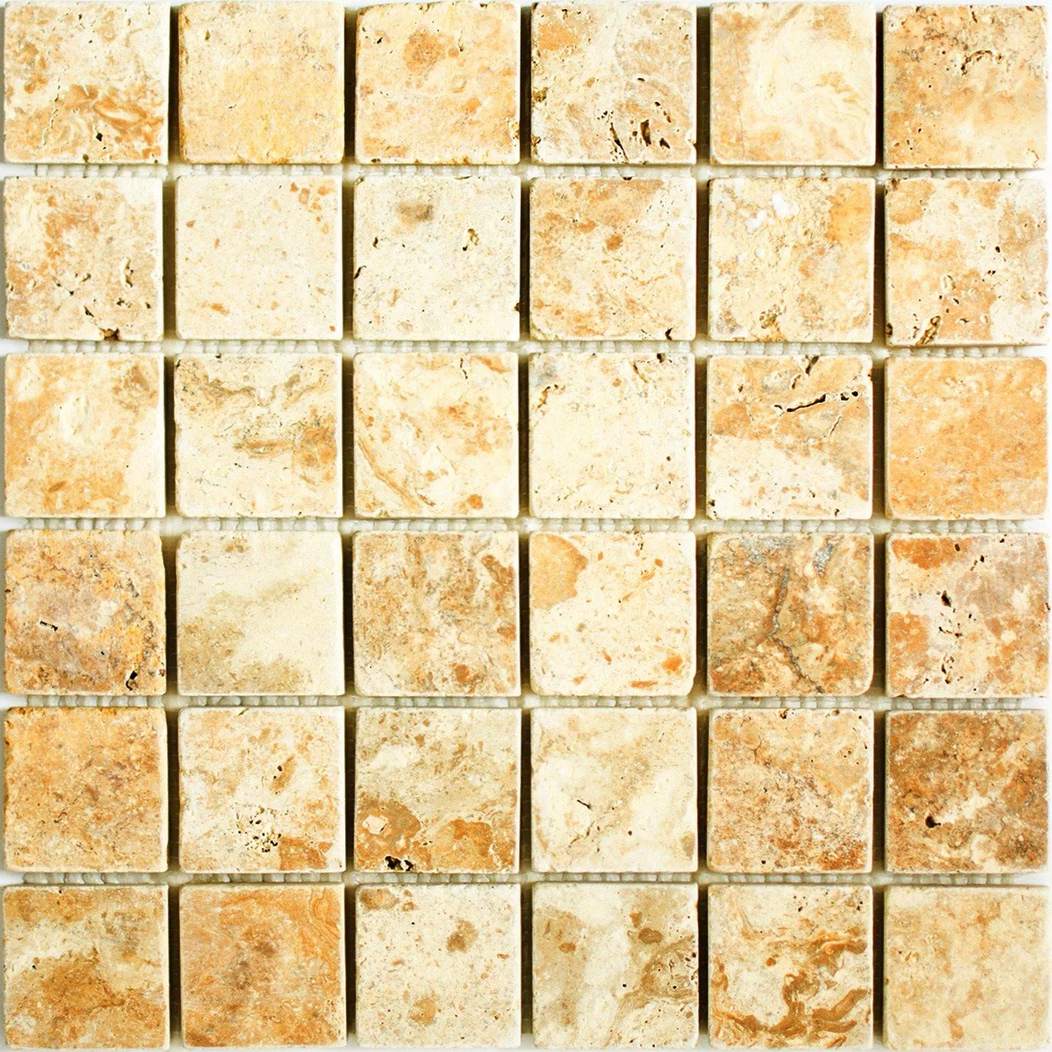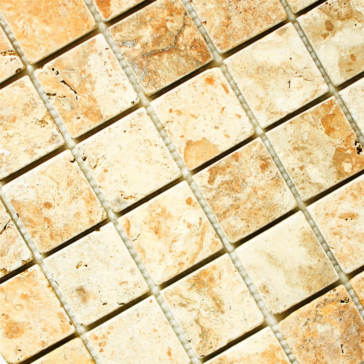 De mozaïektegels Travertin Castello Gold 48 zijn een natuurproduct. Travertijn, de steen uit Tivoli, heeft een bijzonder maritieme charme en het poreuze oppervlak maakt dit natuurproduct zo aantrekkelijk. Deze tegels, met het label Travertin Gold, hebben ook een bepaalde gouden glans in het prachtige kleurenschema. Dit zijn natuurlijke tegels die ook werken met natuurlijkheid en hun levendige oppervlak.