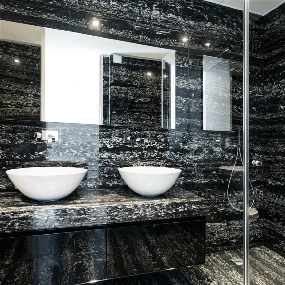 Met de natuursteentegel Discovery Nero Galactica 60x60, die ook nog eens gepolijst is, kan elke badkamer visueel opgefrist worden. Ook als er vloerverwarming wordt gebruikt of als het wat kouder wordt in de badkamer, kunnen deze vloertegels met natuursteenlook die temperatuurschommelingen weerstaan. Natuursteentegellook wanneer zwart en licht elkaar ontmoeten De gepolijste afwerking van fijne steengoedtegels of vloertegels komt pas echt tot zijn recht als aan de juiste verlichting is gedacht.