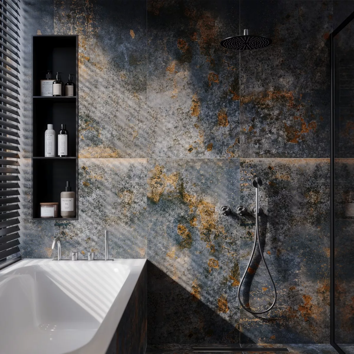 Dankzij de veelzijdigheid en de elegante metallic look worden de Oregon porseleinen vloertegels een blikvanger in elke ruimte – of het nu gaat om privé-woonruimtes of als een duurzame, esthetische oplossing voor buitenruimtes.