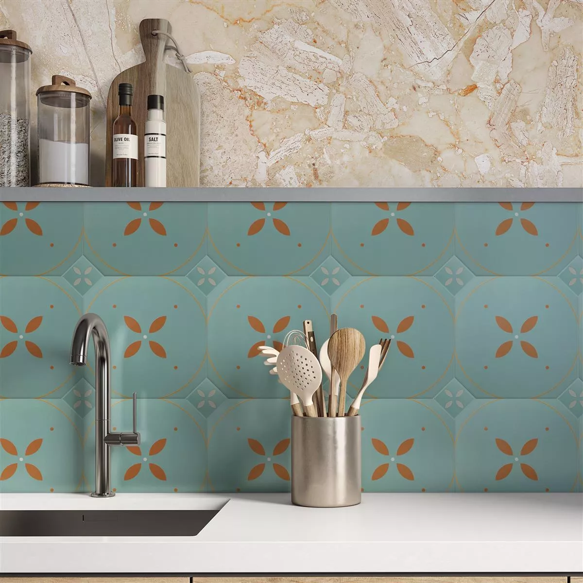 De porseleinen steengoedtegels Genexia Decor Turquoise brengen een bloemige frisheid in uw kamers. Met hun unieke bloemenlook en retro-design zijn ze perfect voor wand- en vloeroppervlakken in keukens, badkamers, douches en woonkamers.