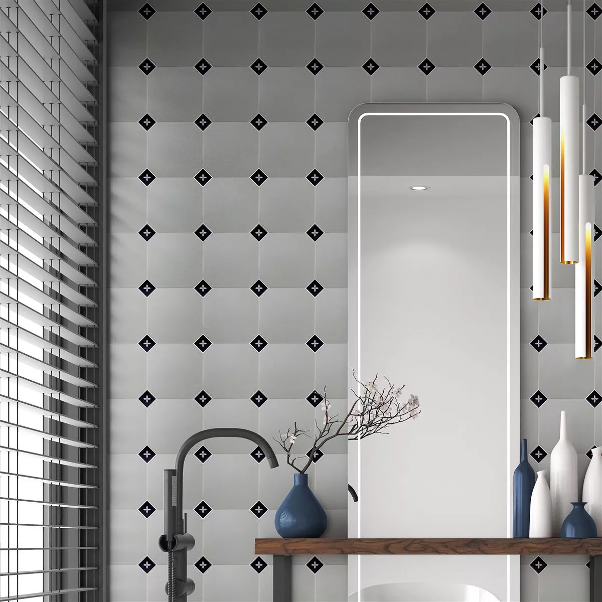 Ontwerp uw huis met stijl en vertrouw op de Genexia Zwart Wit Decor 2 inzetstukken van porseleinen steengoedtegels voor een stijlvolle en moderne sfeer.