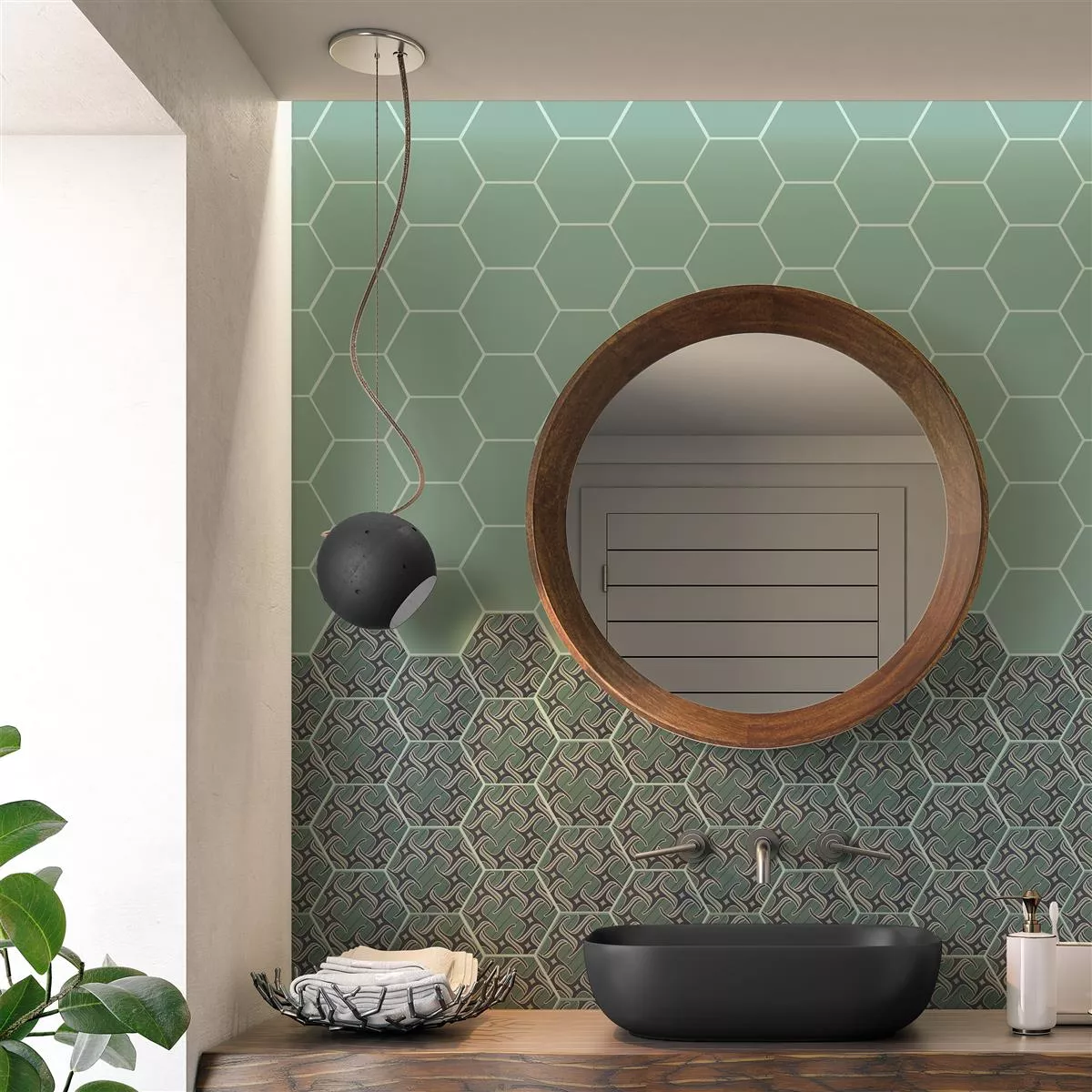 De porseleinen steengoedtegels “Modena Hexagon Decor 4” zijn een kunstwerk voor uw kamer. Met een dikte van 10 mm zijn ze perfect voor natte ruimtes, douches, badkamers, keukens, woonkamers en binnenruimtes. Het matte oppervlak en het ornamentmotief in blauwgroen zorgen voor een unieke sfeer.