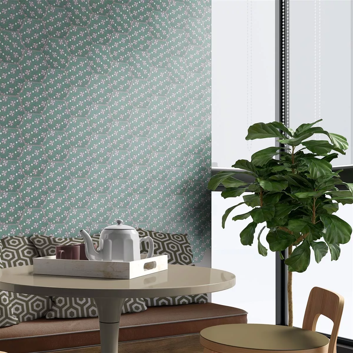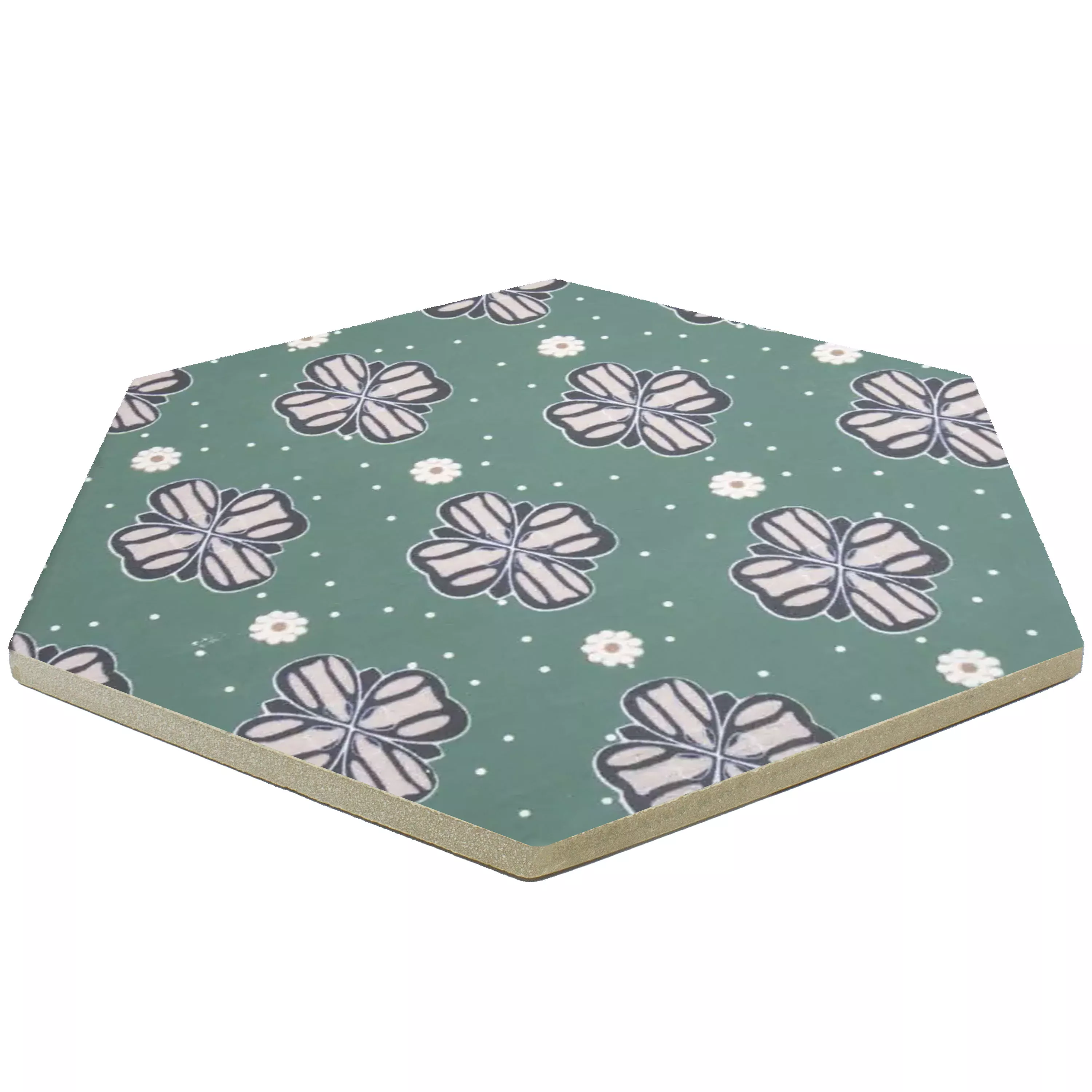 De porseleinen steengoedtegels “Modena Hexagon Decor 7” combineren een indrukwekkend design met hoge functionaliteit. Met een dikte van 10 mm zijn ze perfect voor natte ruimtes, douches, badkamers, keukens, woonkamers en binnenruimtes. Het matte oppervlak, in aantrekkelijk groen met bloemornamenten, geeft de tegels een tijdloos elegante uitstraling.