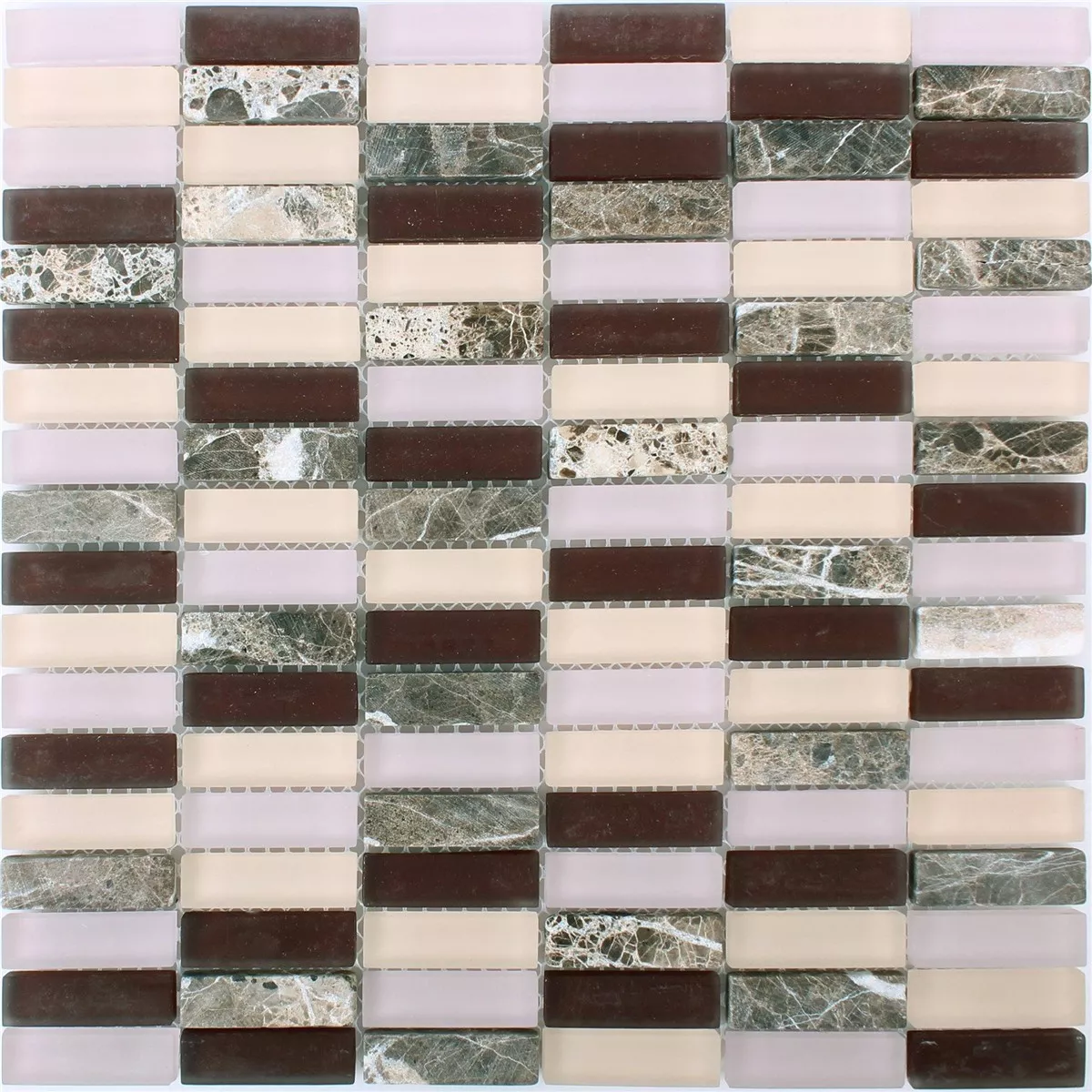 De Conrad glasmozaïek natuursteentegels hebben stenen in de kleuren paars, bruin, beige en bordeaux. De steengrootte is 15x50mm. Het product bestaat uit een fascinerende combinatie van materialen glas en natuursteen. De 8 mm dikke stenen zijn bevestigd op een mat van 30x30 cm, waardoor ze gemakkelijk en comfortabel te leggen zijn.