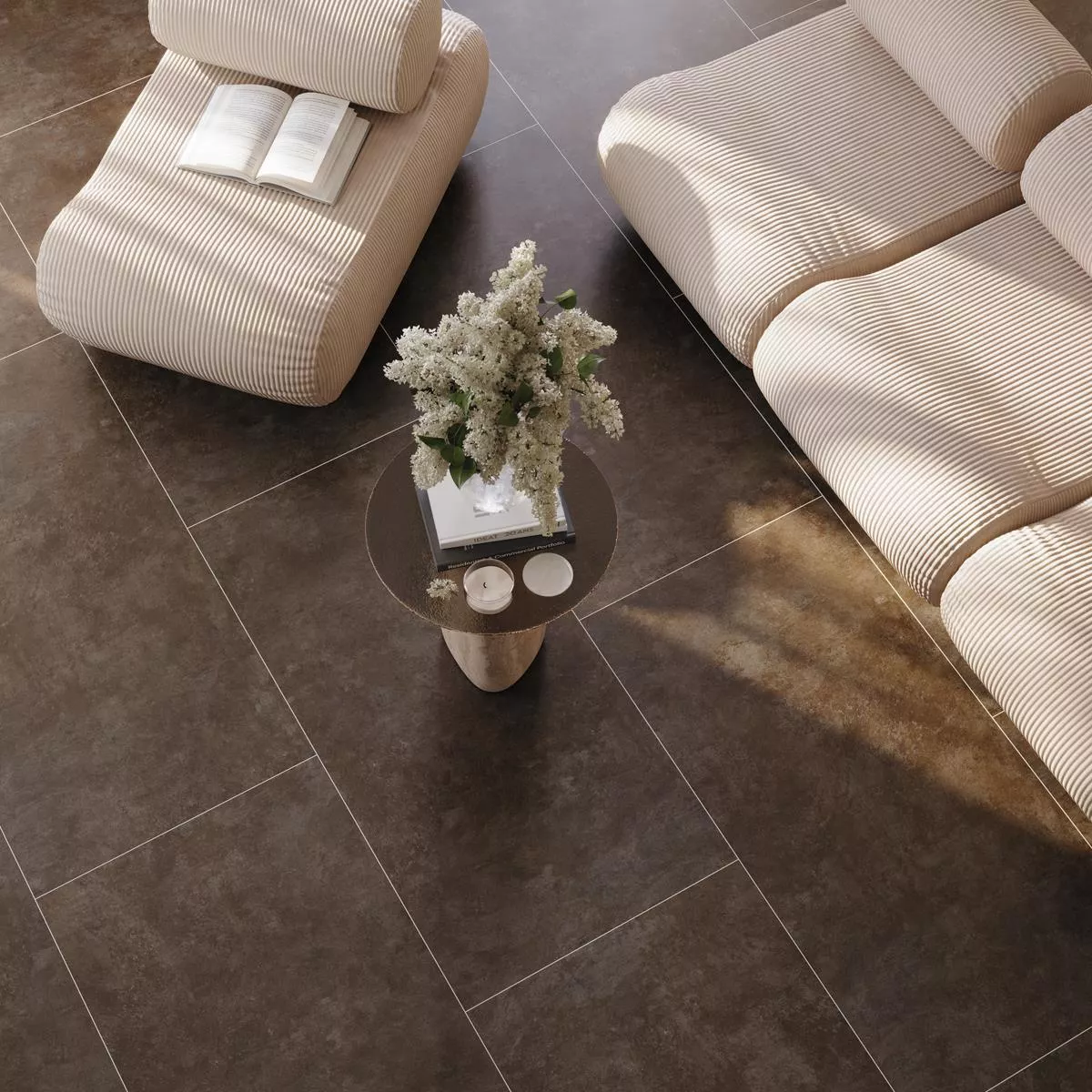 De Triton porseleinen vloertegel in elegant bruin overtuigt door zijn moderne betonlook en geeft woonkamers en buitenruimtes een stijlvolle, eigentijdse sfeer. Met zijn royale formaat van 60 x 120 cm en het matte, geglazuurde oppervlak creëert het een harmonieus totaalbeeld dat zowel in minimalistische als in gezellige interieurconcepten goed tot zijn recht komt.