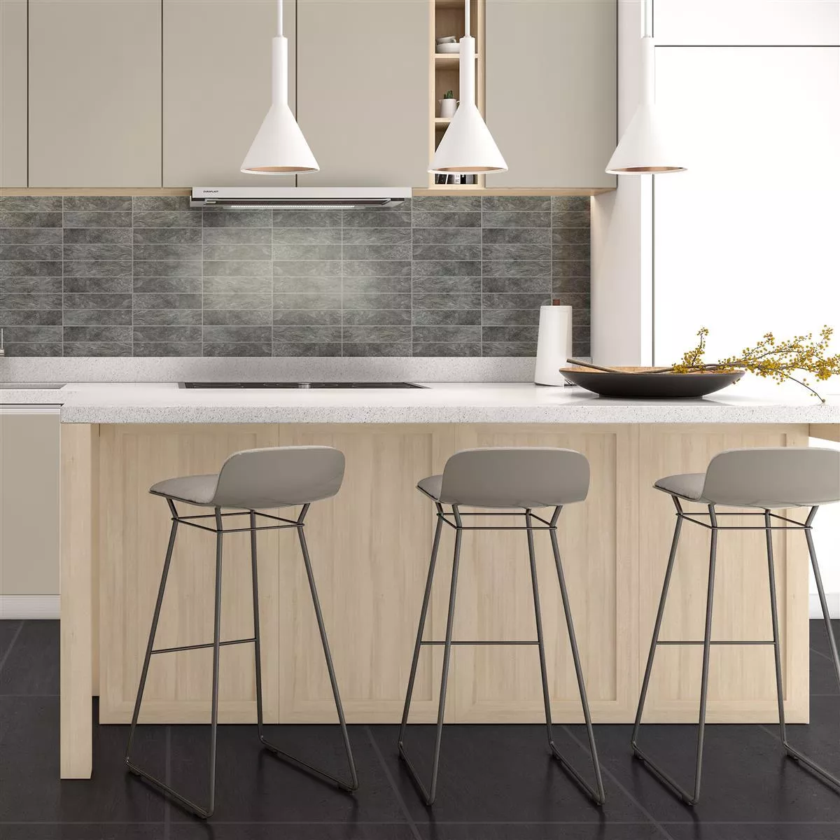 De antracietkleur geeft de tegels een elegante en tijdloze esthetiek. Het matte oppervlak zorgt voor een aangenaam gevoel en voorkomt tegelijkertijd het ontstaan van reflecties of reflecties. Het golvende en gestructureerde oppervlak geeft de tegels ook een interessante textuur die het licht op een speciale manier vangt, waardoor een uniek visueel effect ontstaat.