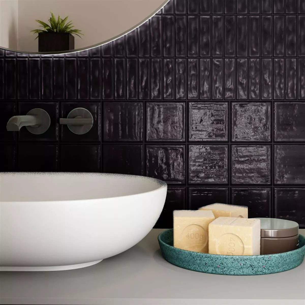 Voeg een vleugje verfijning toe aan je muren met onze Verbania geglazuurde golvende wandtegels in zwart. Deze vierkante tegels van 20x20 cm en 7,8 mm dik geven je kamer een elegante vintage look. Het glanzende oppervlak en de golvende textuur zorgen voor een aantrekkelijke visuele dynamiek.