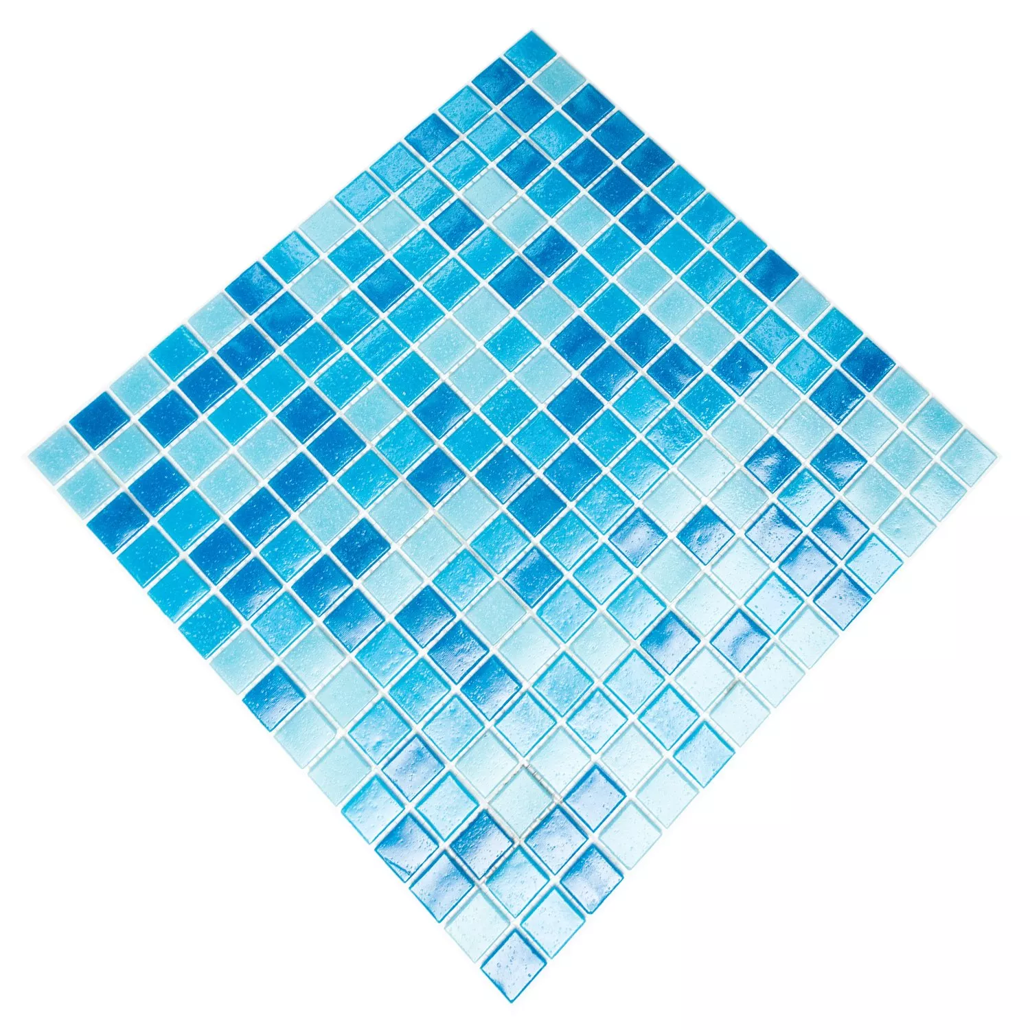 Blauwe mozaïektegels voor binnen- of buitenzwembad. Papier verlijmen maakt het snijden gemakkelijker voor de vakman. Dankzij het glazen oppervlak zijn ze snel schoon te maken.-